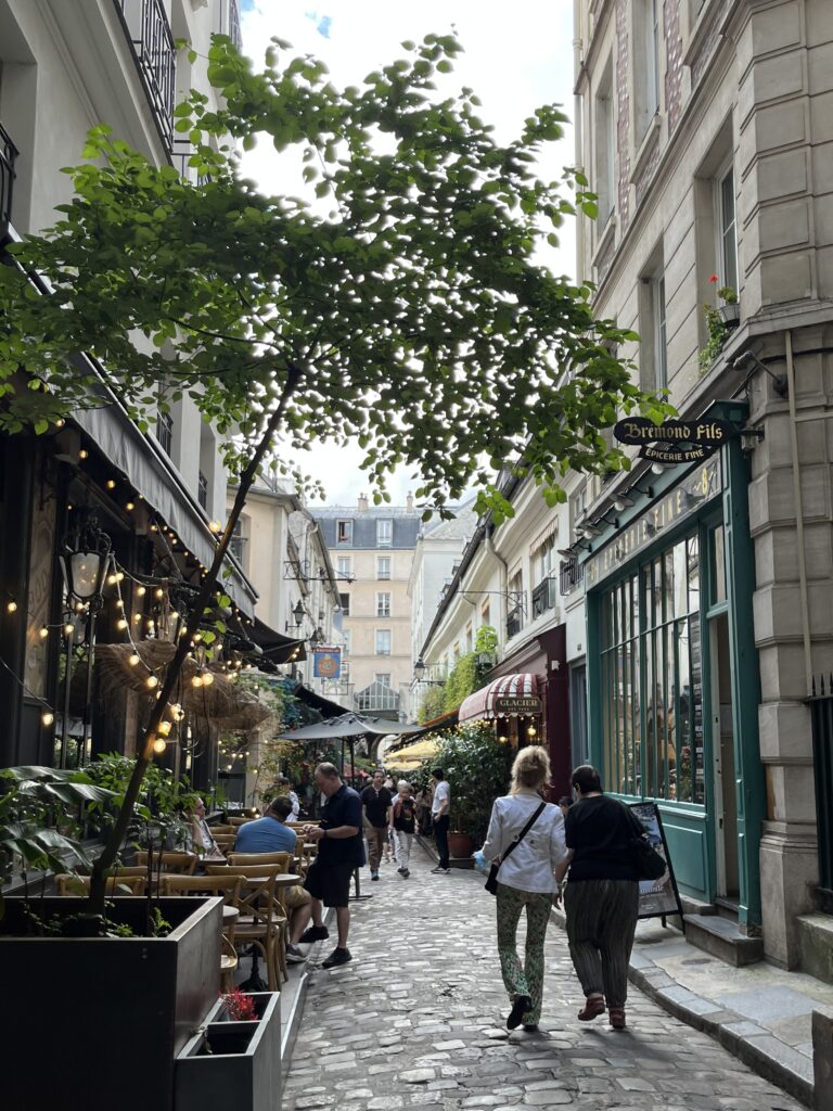 おしゃれなレストランやバーが並ぶ、石畳の小さな通り。